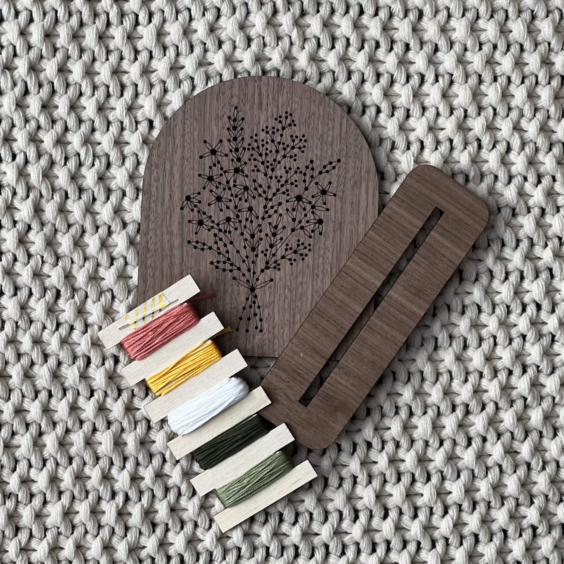 Enjoy the art of embroidery on wood! The holes are predrilled on walnut. Embroider in a similar manner as you would on fabric, using a backstitch, lazy daisy and colonial knots to create a beautiful daisy bouquet.