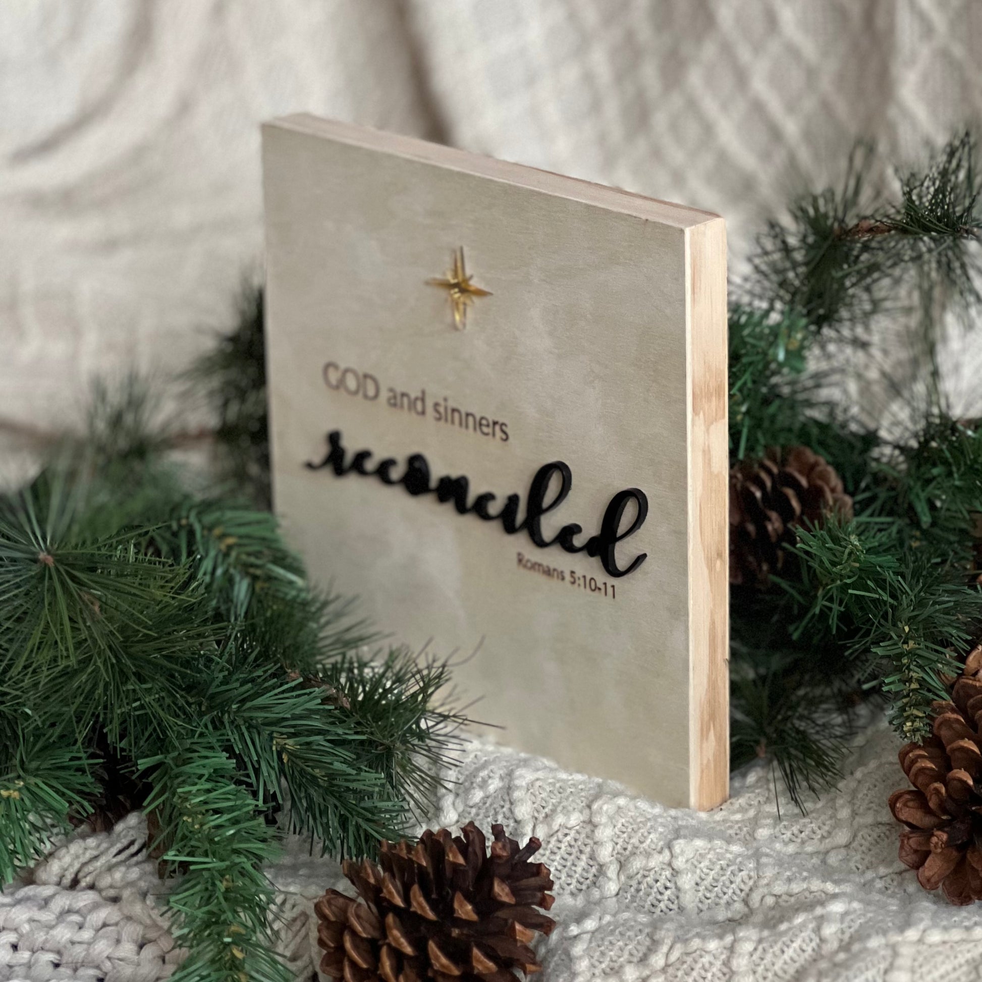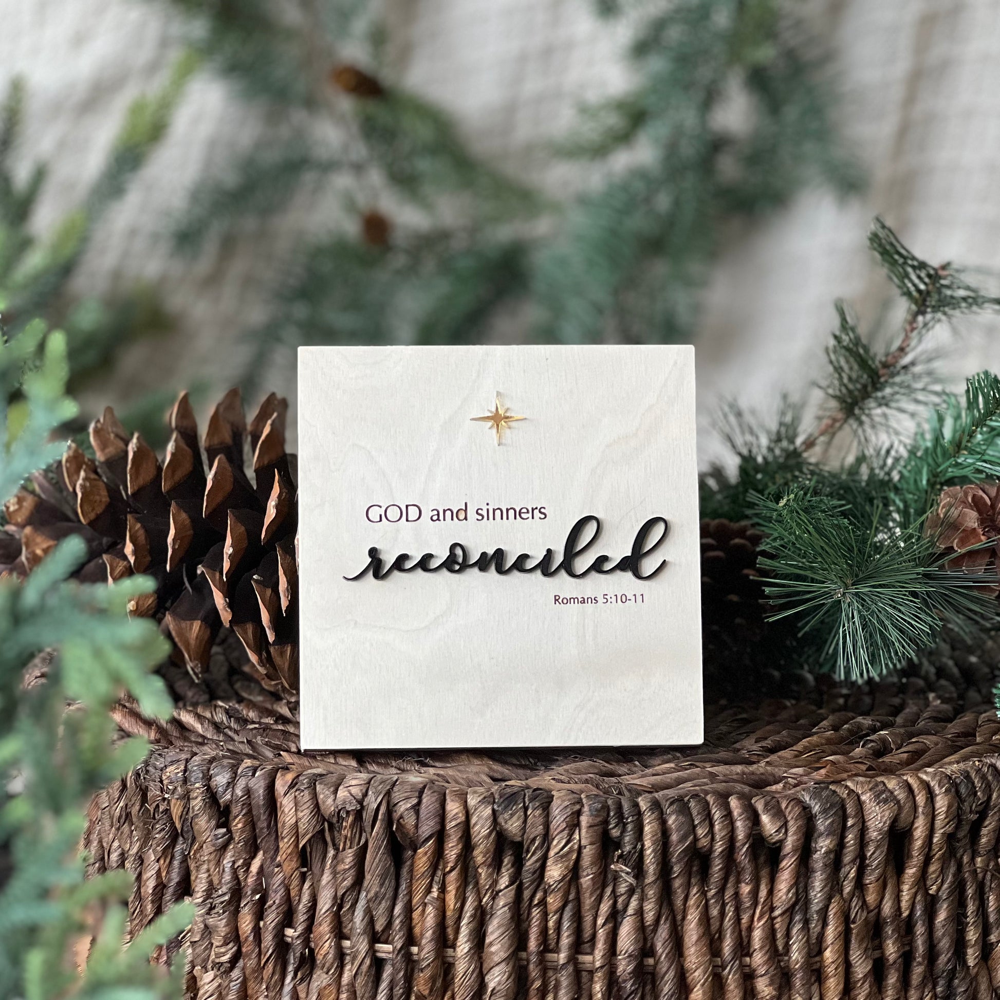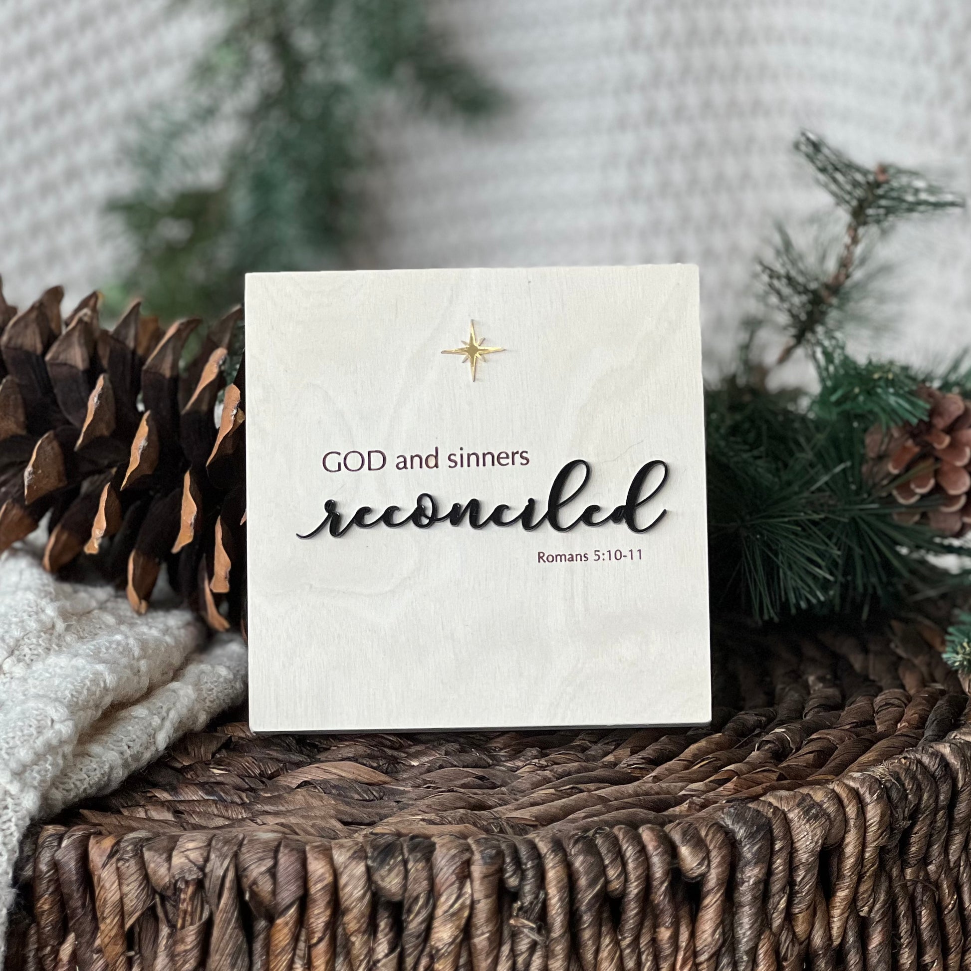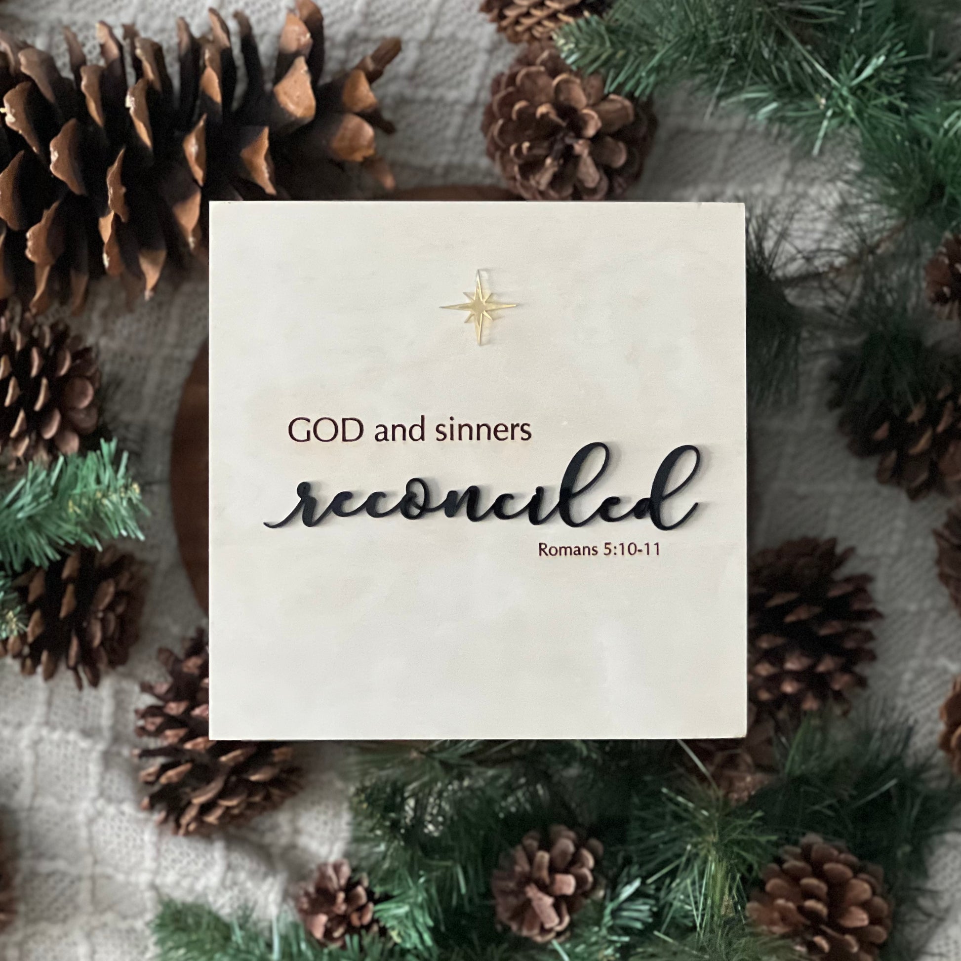 Square sign made of a birch wood panel with black acrylic. The words, "God and sinner reconciled. Romans 5:10-11" appear. Size: 6x6 or 8x8