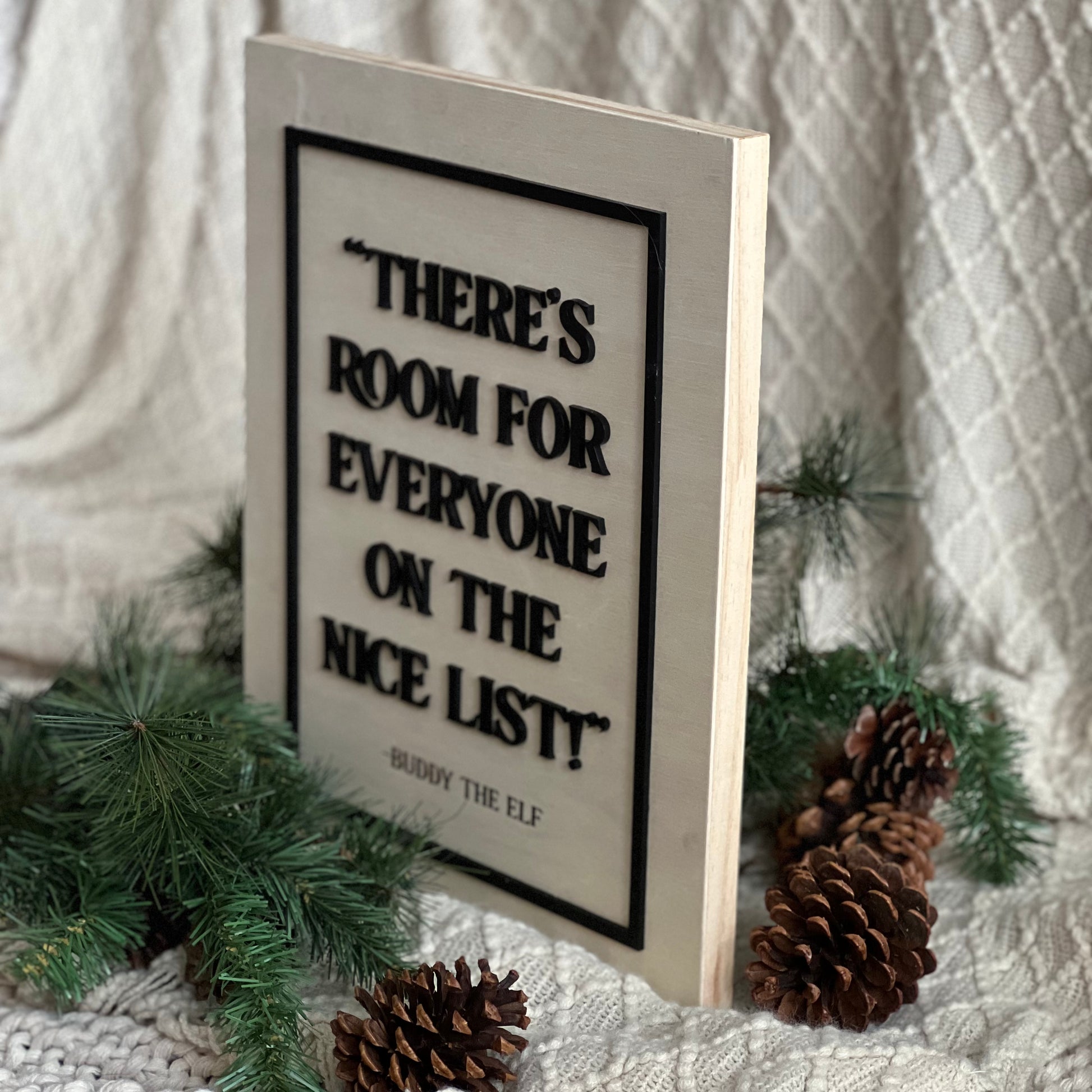 Buddy the Elf reminds us "There's room for everyone on the nice list!" This is a rectangular sign made of a birch wood panel with black acrylic. Size 11x14