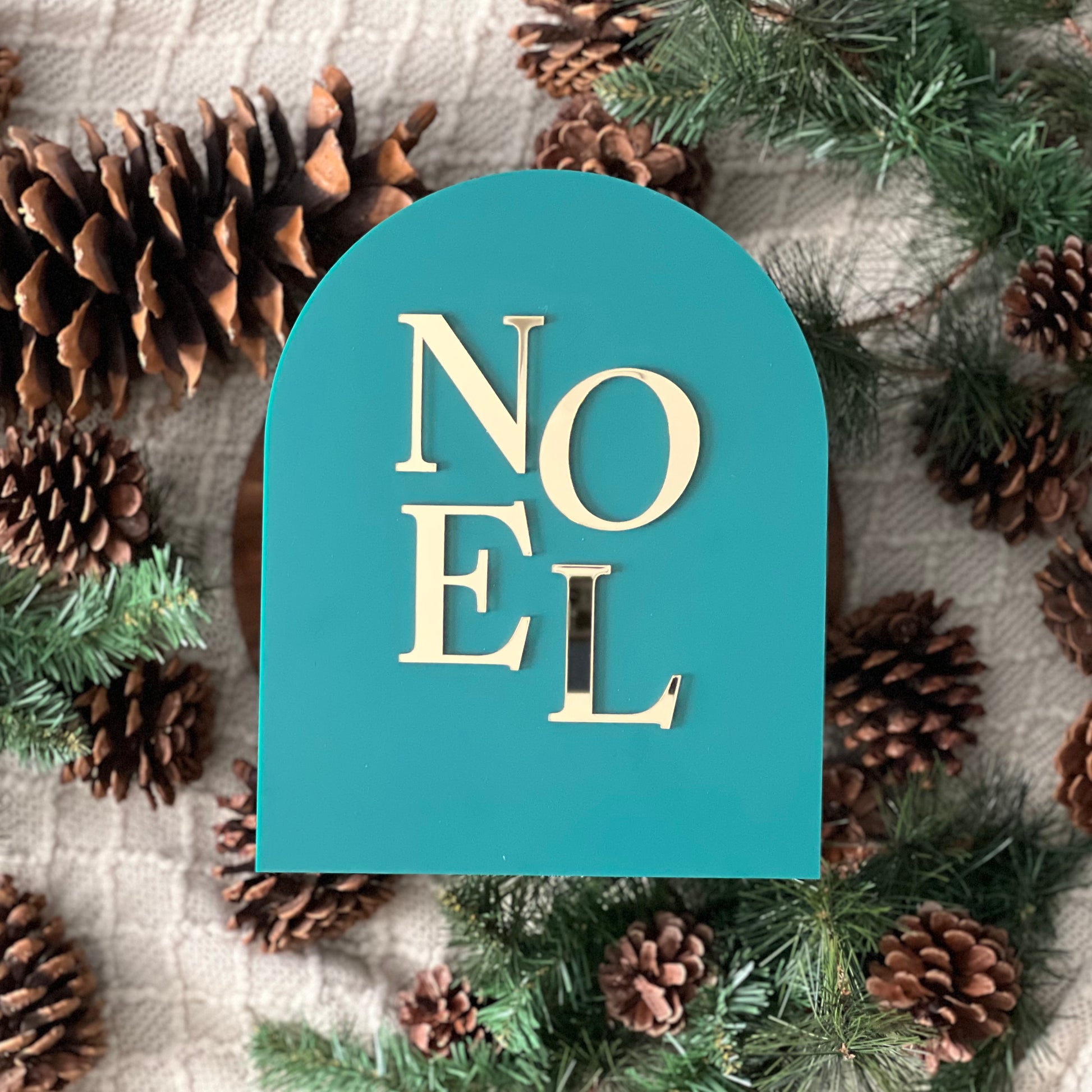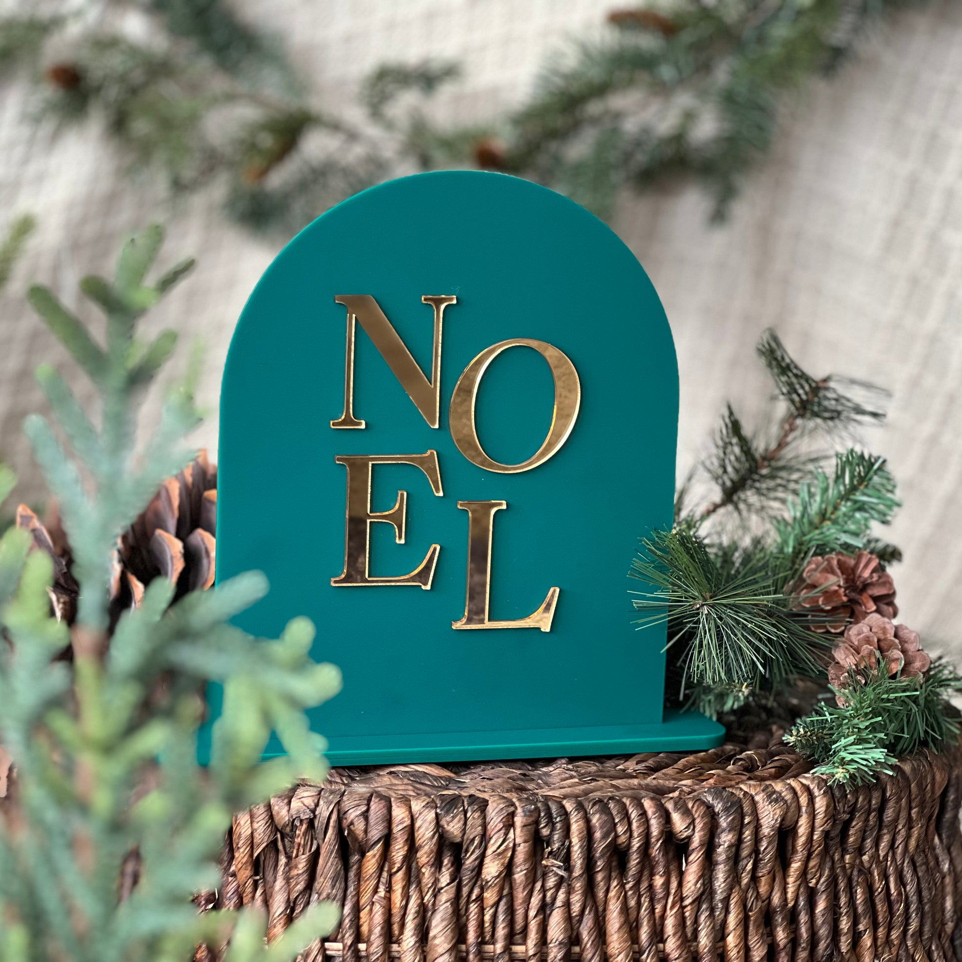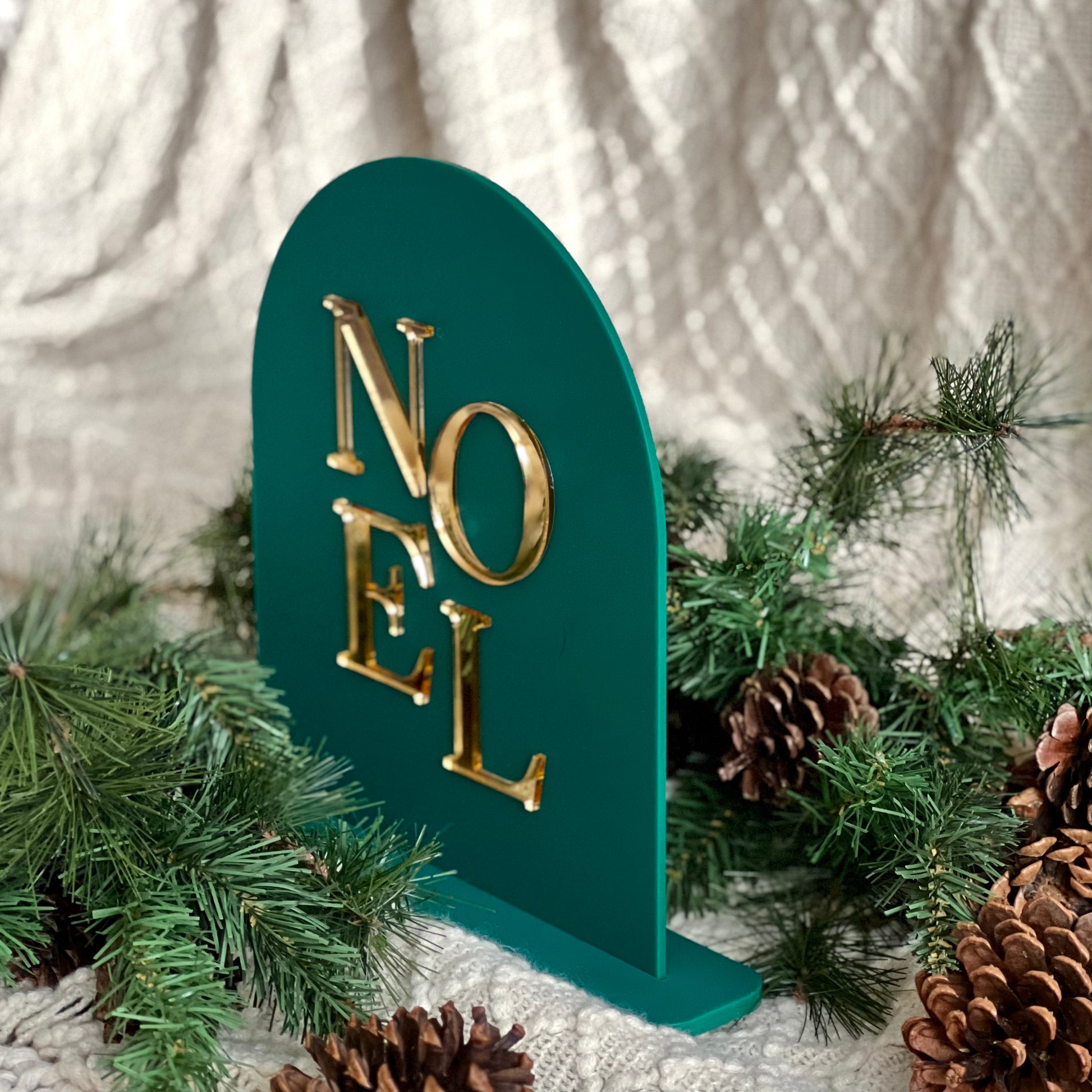 Arched sign with gold acrylic letters that reads, "NOEL" mounted on dark green acrylic. Size: 8x10 free standing sign with acrylic base plate.