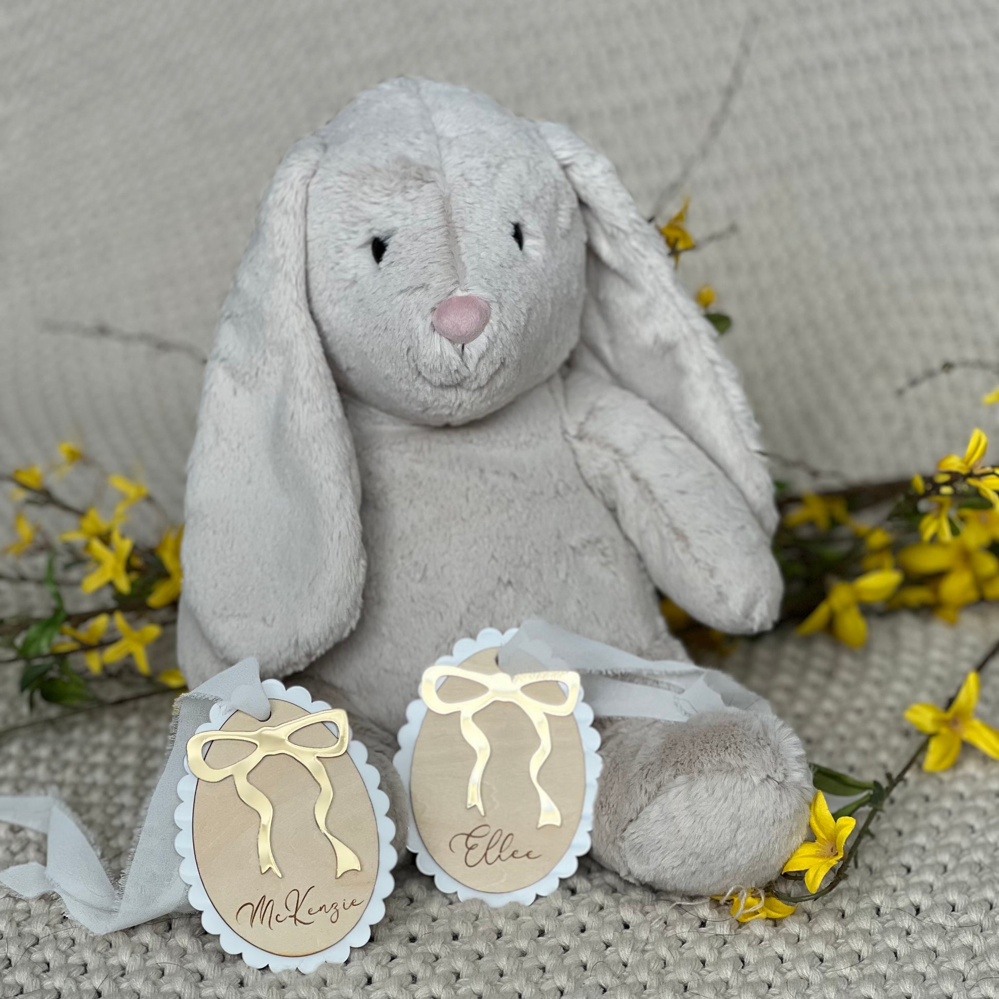 This tag features a mirrored gold bow with the name of your choice engraved on birch wood.