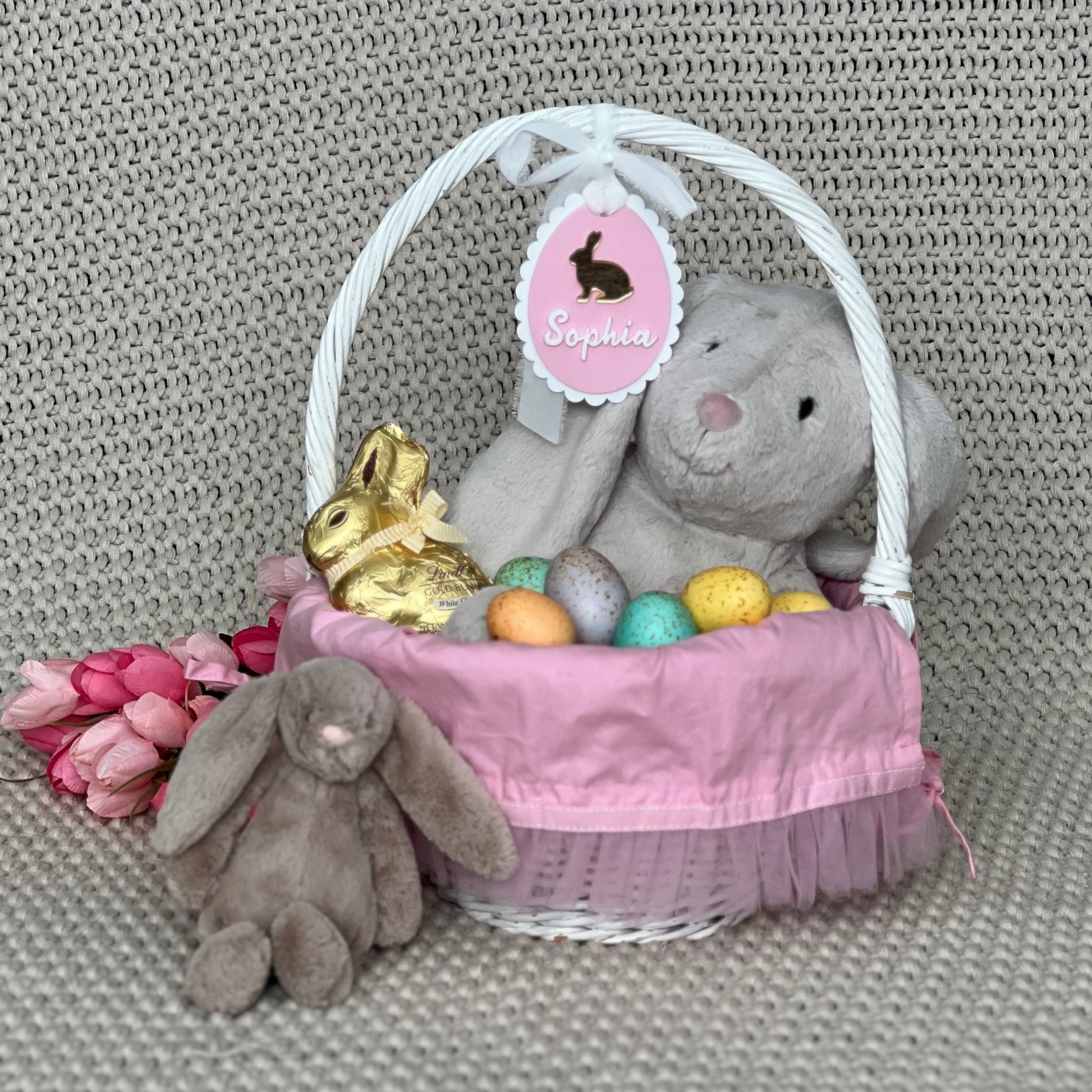 This tag features a mirrored gold bunny with the name of your choice in white acrylic.