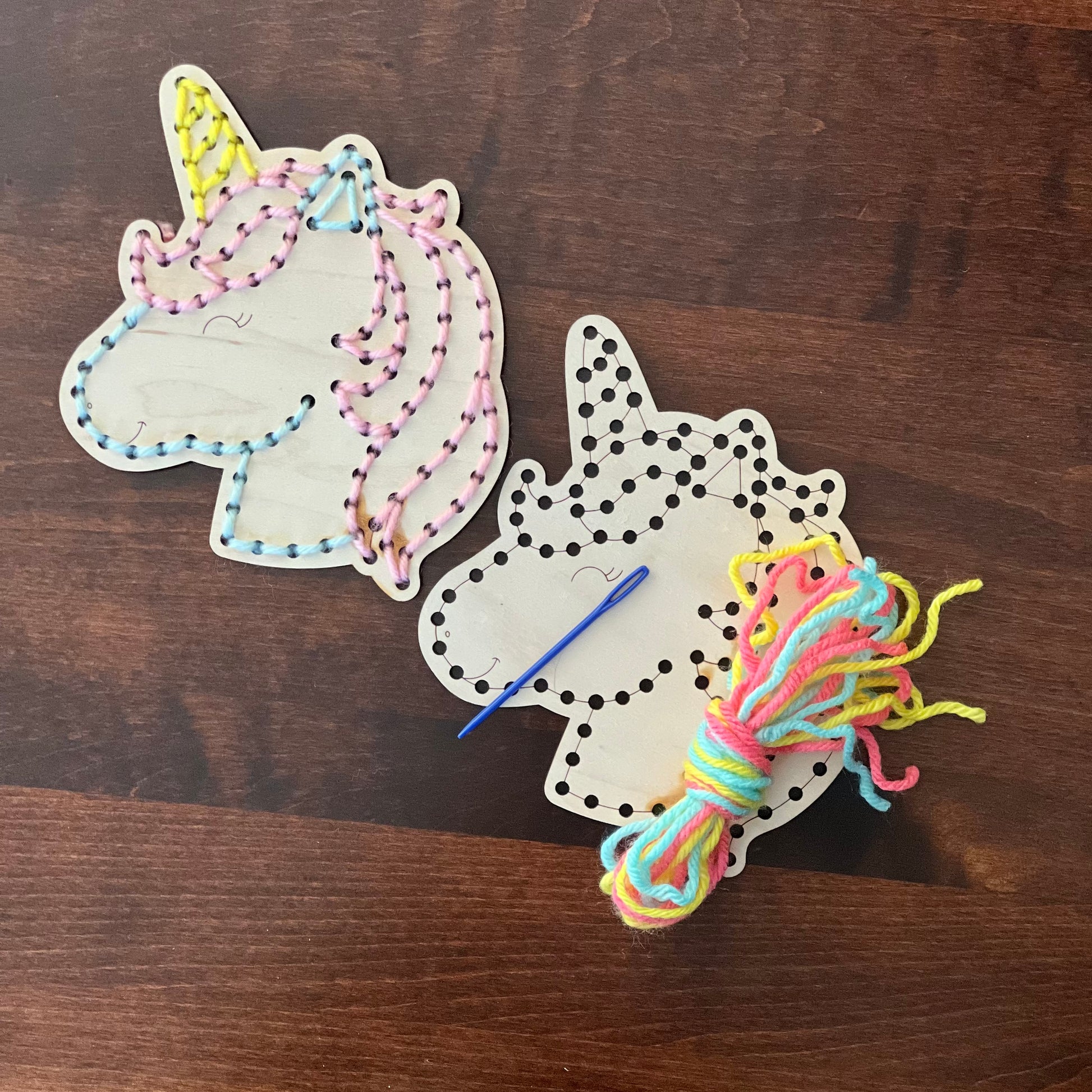 Kit includes wood design, plastic yarn needle, bundle of yarn and instructions sheet.